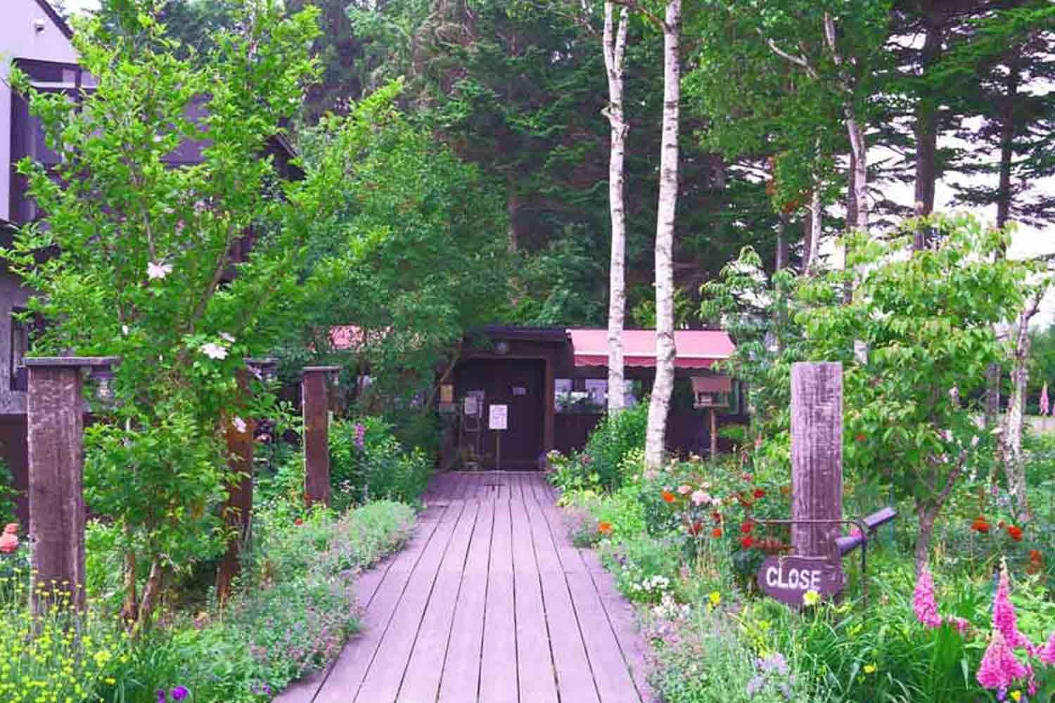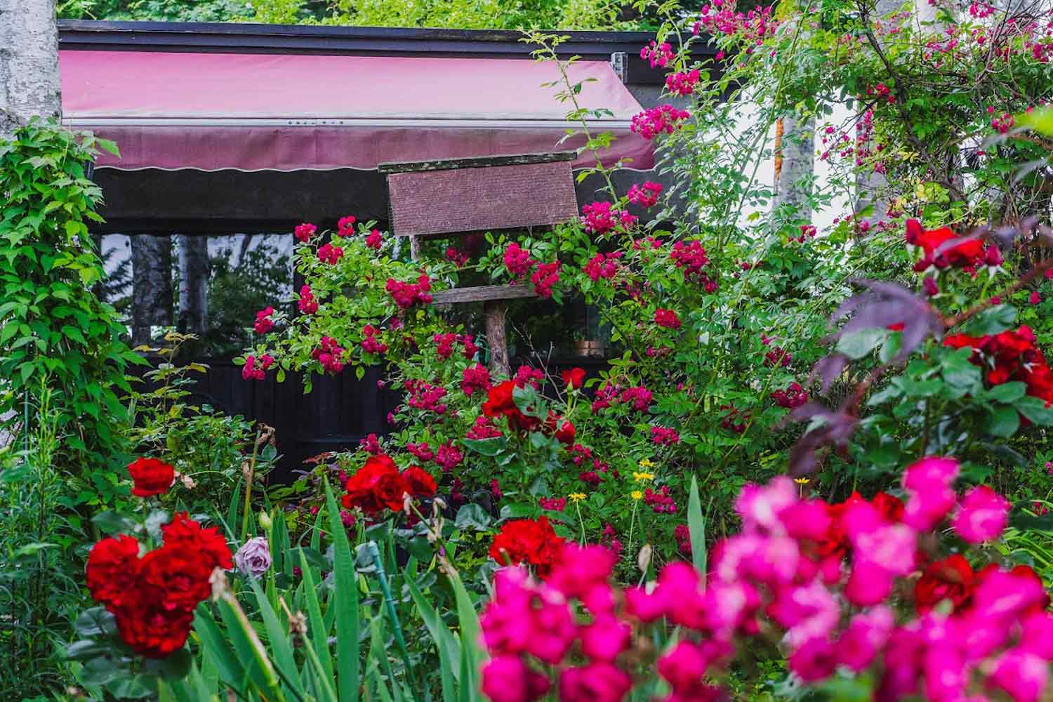 レストランの周囲は25年目の庭。オープン当時植えられた草花は、自ら種を飛ばしたり、ランナーを伸ばしたりしながら、いろいろな場所から生え、季節ごとに色とりどりの花を咲かせています。
