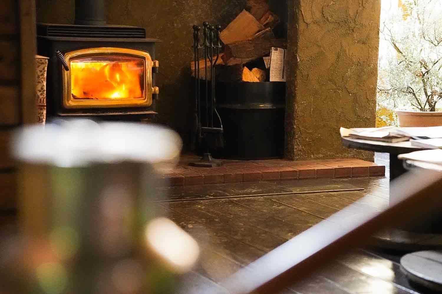 レストラン中二階はお待ちいただくお客様のスペース。手作り小物が並べられた店内の薪ストーブはもちろん本物。冬になるとオレンジ色の炎がやさしく暖めてくれます。2階からは、庭に花も緑もない代わりに、真っ白な雪原を眺めながらお食事ができるのも冬だけのお楽しみです。