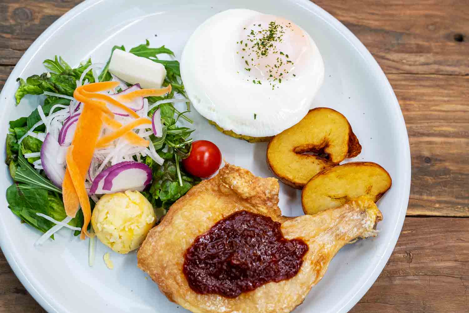 カリカリに揚げたチキンレッグのBBQソースと目玉焼きをのせたバターライス、サラダのワンプレート。お子様にも大人気のメニューです。