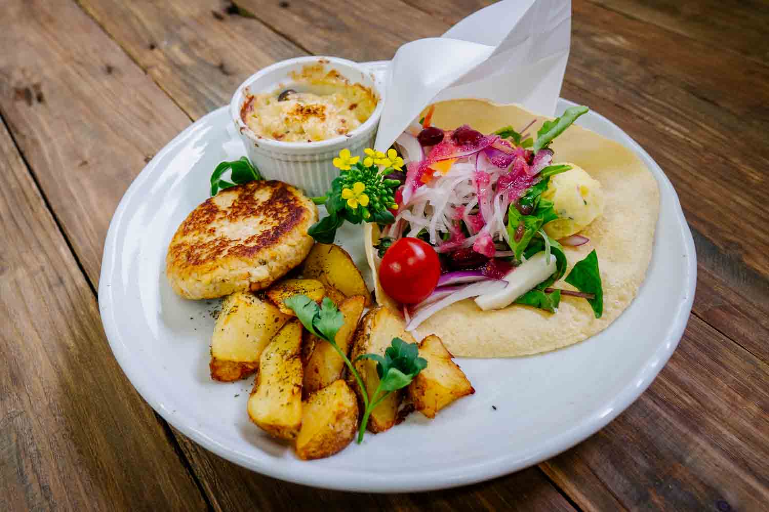 農園コロッケ、長いも(かぼちゃ)グラタン、インカのめざめ、パパダムサラダ(レンズ豆から作られた薄いクラッカーの中にフレッシュサラダと蒸し鶏が入っています。少し辛めのドレッシング)